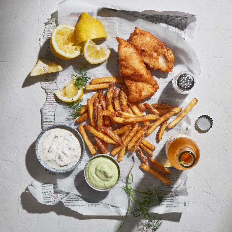 Fish & Chips basilikahummuksella ja remouladekastikkeella