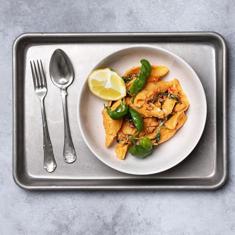 Hummuspasta aurinkokuivattujen tomaattien kera