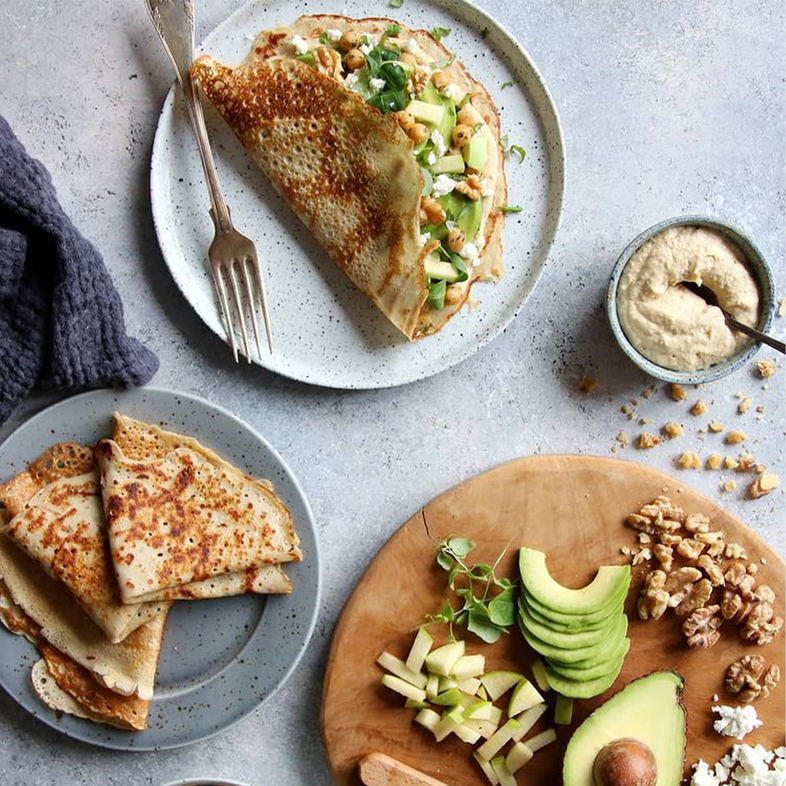 Täytä letut voidellen ne hummuksella ja väliin salaattia, avokadoa, omenaa, marinoidut kikherneet, fetajuusto ja saksanpähkinät. Päälle ripaus oliiviöljyä, hunajaa ja sitruunamehua. Yrttejä vielä koristamaan ja maustamaan annosta.