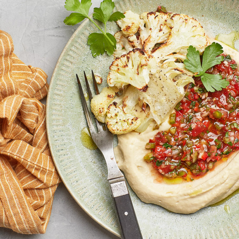 Reseptissä original hummuksemme päälle laitetaan paahdettua kukkakaalia ja turkkilaista tomaattisalaattia ezmeä. Suosittelemme lisukkeeksi jotain herkullista leipää.