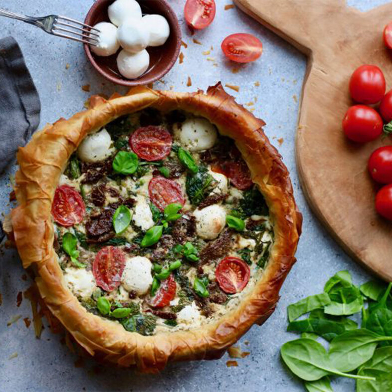 Unohda piirakkataikina ja käytä sen sijaan filotaikinaa! Tämä piirakka on helppo ja nopea tehdä. Maukas juustoraaste ja labneh lisäävät luonnetta, samoin aurinkokuivatut tomaatit ja oregano. Tarjoile piirakka ihanan salaatin kanssa.