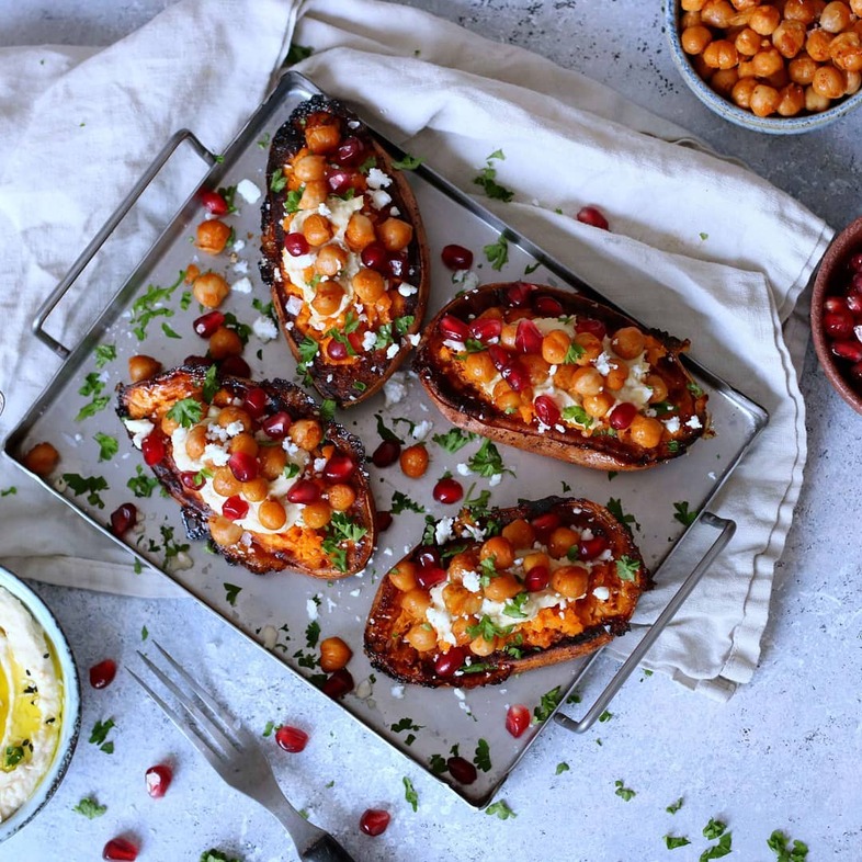 Bataatti ja hummus ovat täydellinen yhdistelmä! Paistetut kikherneet saavat paprikajauheesta ihanan savuisen maun.