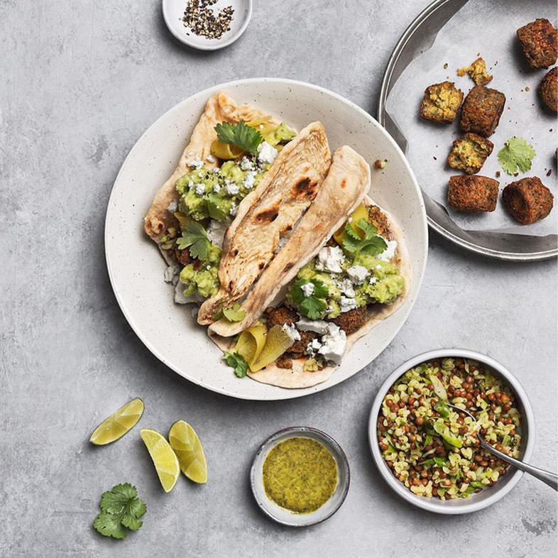 5. Tarjoilu: Täytä leivät linssisalaatilla, falafeleilla, fetajuustolla, villikurkulla ja guacamolella.