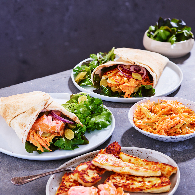 Wrap tulisella hummussalaatilla ja lämminsavulohella tai grillijuustolla