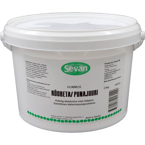 Kikherneitä (63%), punajuuria (13%), vettä, seesamitahna, suola, valkosipuli, happamuudensäätöaine: sitruunahappo, säilöntäaine: kaliumsorbaatti.